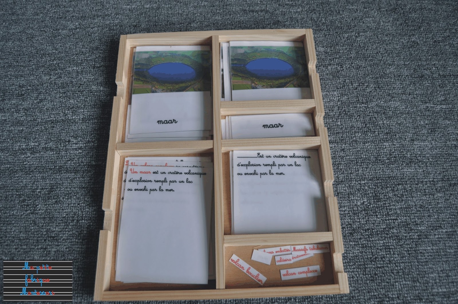 Voici mon coffret sur les éruptions volcaniques, il s'utilise de la même manière que les coffrets zoologie et botanique. Vendu avec couvercle.